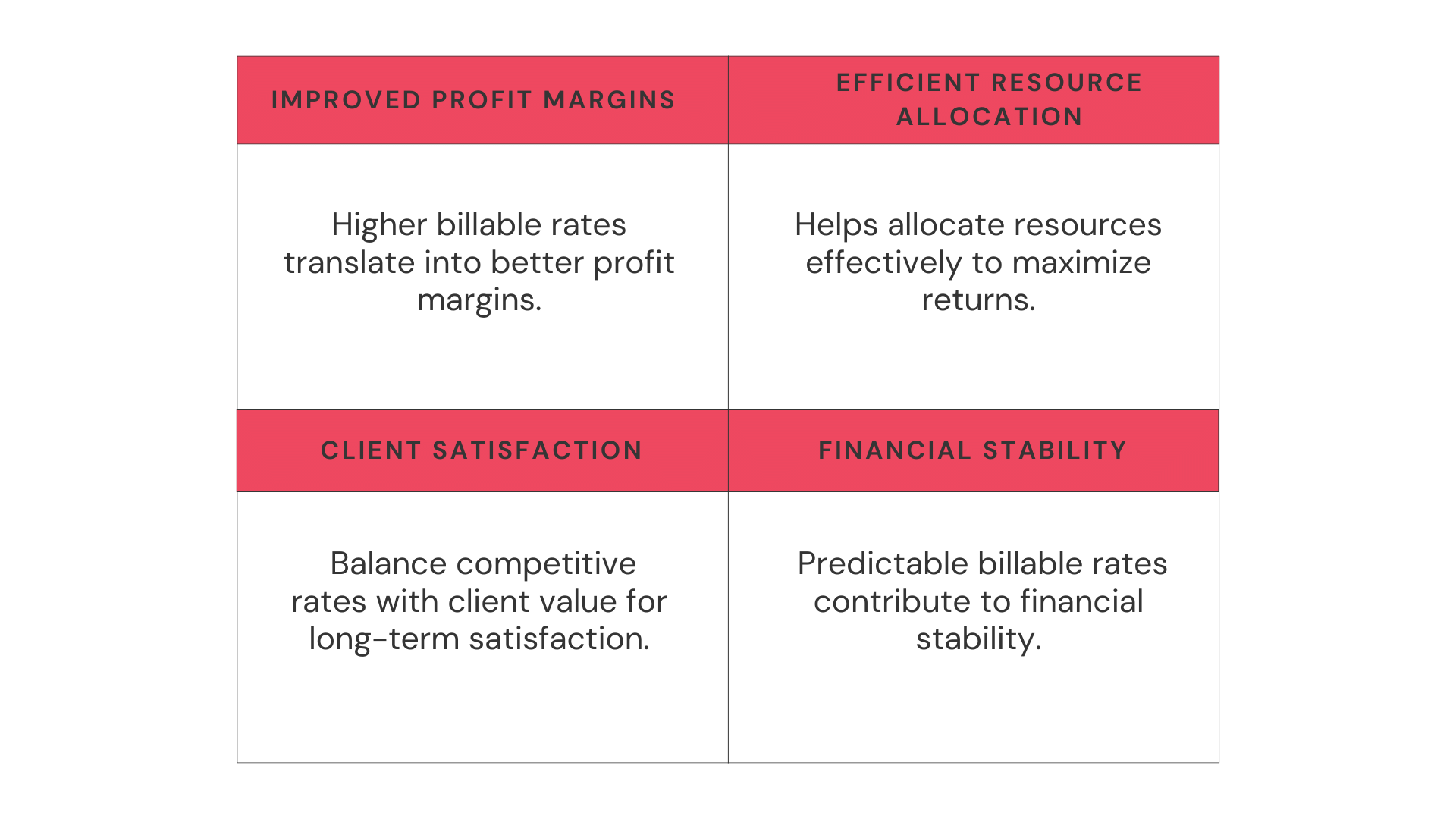 Finally, billable rates can influence employee satisfaction. If employees feel they’re being undervalued (i.e., their work is being billed at a high rate, but they’re not seeing the benefits), it can lead to dissatisfaction and high turnover.